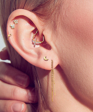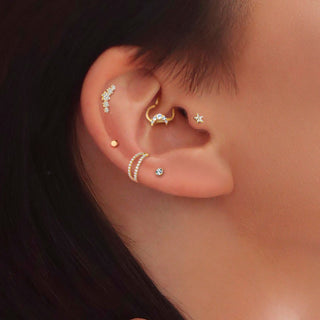 "Curated Ear" odnosi się do celowego i artystycznego rozmieszczenia kilku kolczyków w jednym lub obu uszach. Jest to koncepcja w świecie biżuterii i kolczyków do piercingu, która polega na stworzeniu spójnego, harmonijnego i spersonalizowanego wyglądu ucha poprzez staranny dobór umiejscowienia i rodzaju kolczyków. Ucho każdej osoby jest wyjątkowe, opowiada historię lub wyraża aspekt jej osobowości.